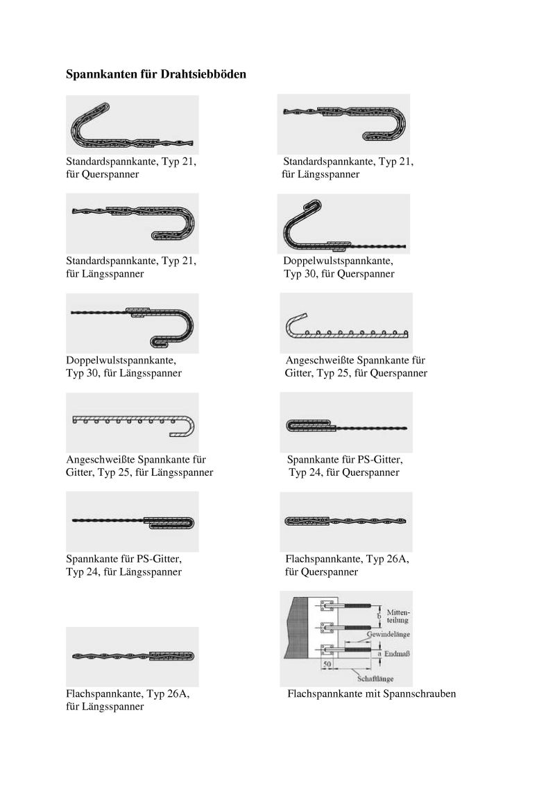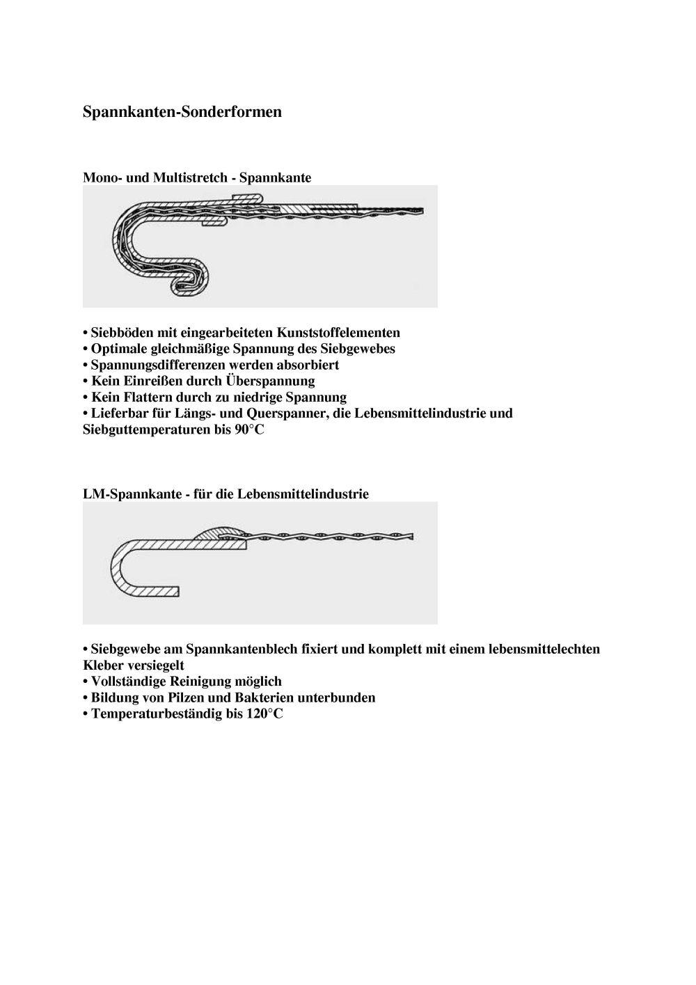 - Verschiedene Spannfalzformen, Ausklinkungen, Siebbodenüberstände, Kantenverstärkungen, integrierte Polyurethan-Streifen für die Siebbodenauflage und viele andere Sonderausführungen können geliefert werden.
